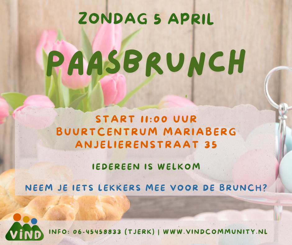 Daarna is er om 11:00 uur een feestelijke brunch in Buurtcentrum Mariaberg. Ook hier geldt: iedereen is welkom. De activiteiten zijn gratis. Bij de brunch vinden we het heel leuk als je iets bijdraagt aan het eten. Lekker brood, eieren, sap, fruit…. iets wat jij lekker vindt! Voor de kinderen is er een eier-zoek-activiteit.