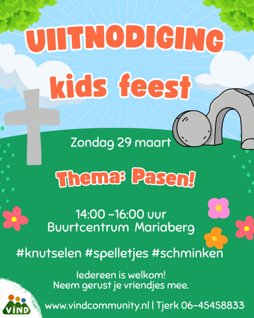 Met de kinderen vieren we het feest op Palmzondag, zondag 29 maart. Alle kinderen en kleinkinderen zijn welkom in Buurtcentrum Mariaberg voor een feestje inclusief spelletjes, knutselen, muziek, schminken, suikerspin, muziek. Allemaal rond het thema: Pasen! Het wordt supergezellig!